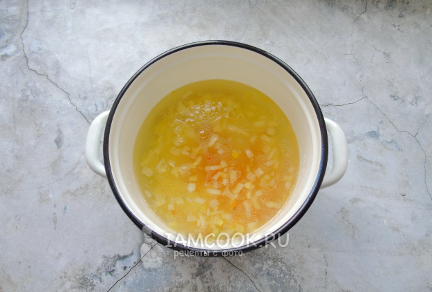 В кастрюлю налейте воду. Картофель очистите, помойте и нарежьте, добавьте в кастрюлю. Выложите лук с морковью. Поставьте кастрюлю на плиту и начинайте варить суп.