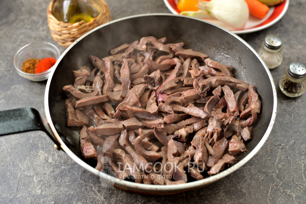 Нарежьте сердце тонкой соломкой, выложите в разогретое растительное масло, обжарьте сначала на сильном огне до румяной корочки. Затем уменьшите огонь под сковородой до минимума, подлейте воды, накройте крышкой и тушите минут 40-50. Чем дольше тушиться сердце, тем мягче оно будет в итоге.