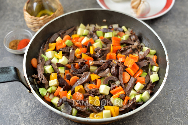 Очистите болгарский перец от семечек и плодоножки, нарежьте его вместе с кабачком кубиком, переложите в сковороду, обжарьте еще минут 5. Дальше влейте воды столько, чтобы она покрывала сердце с овощами до половины. Накройте сковороду крышкой и тушите еще 10 минут.