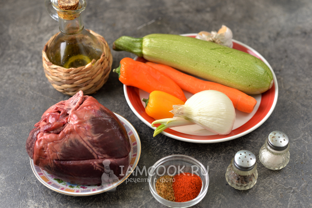 Соберите все необходимые продукты для приготовления тушеного свиного сердца с овощами.