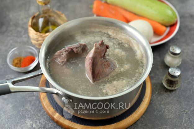 Вскипятите в сотейнике воду. Сердце надрежьте с одной стороны, выложите в кипяток и варите минут 15 на тихом огне. В процессе соберите пену. Дальше слейте воду, а субпродукт промойте под холодной водой.