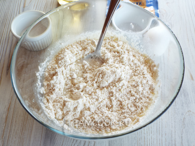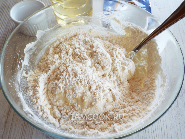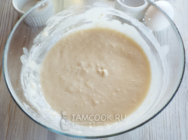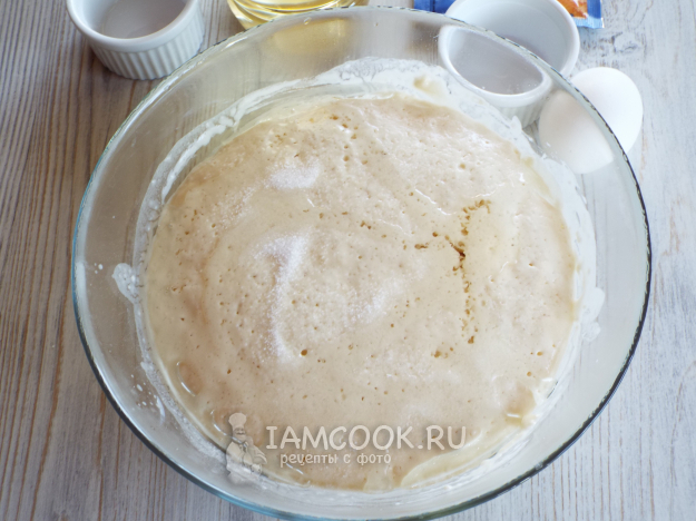 Воду и молоко немного подогреть, добавить дрожжи и сахар.