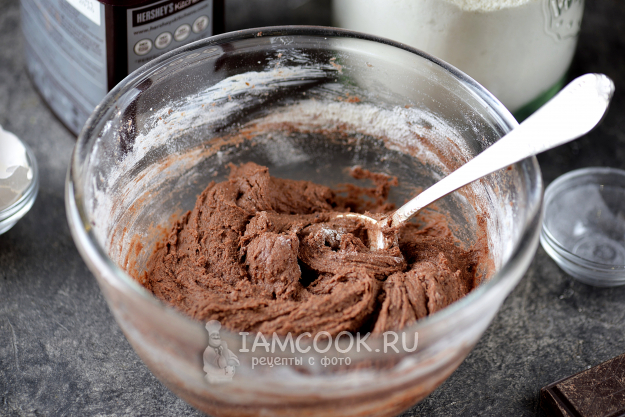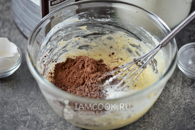 Натрите черный шоколад, добавьте его вместе с какао и разрыхлителем, еще раз хорошенько взбейте.