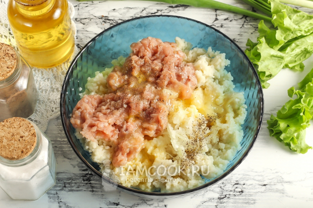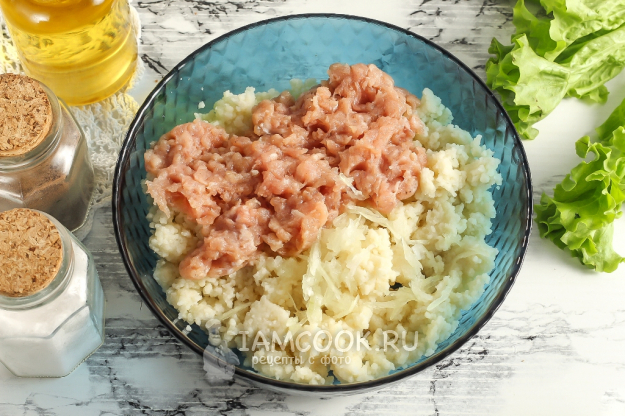 Разделите кускус на две части и выложите каждую из них в глубокую емкость. В первую добавьте мясной фарш любого сорта и натрите четвертинку очищенной луковицы.