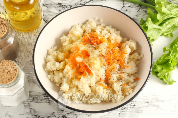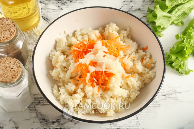 Во вторую натрите четвертинку луковицы и немного моркови. Овощи добавляются для вкуса и аромата, основная масса - это кускус.