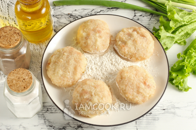 Всыпьте пшеничную муку на тарелку. Смочите руки в воде и вылепите заготовки котлет из каждой массы.