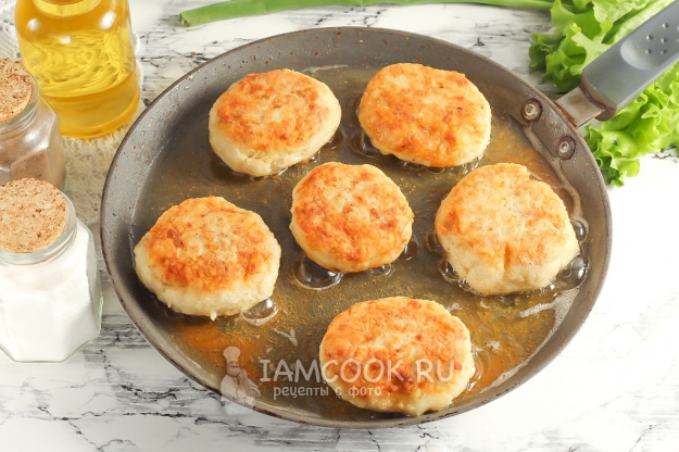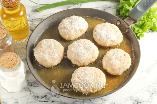 Разогрейте растительное масло на сковороде и выложите в него заготовки. Обязательно разогрейте масло перед выкладыванием котлет, иначе мука упадет в масло и будет подгорать.