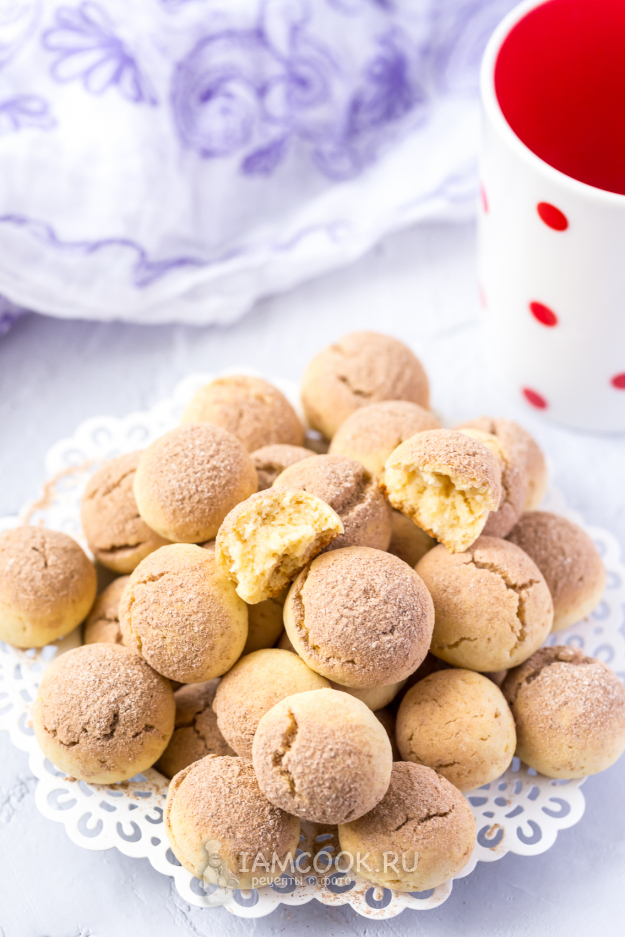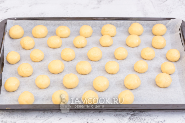 От теста отщипывайте кусочки и формируйте из них колобки размером с грецкий орех (на фото вы видите всю партию печенья).