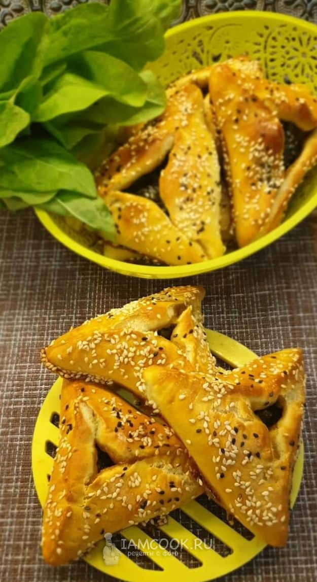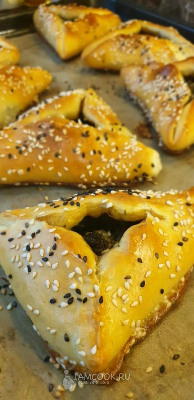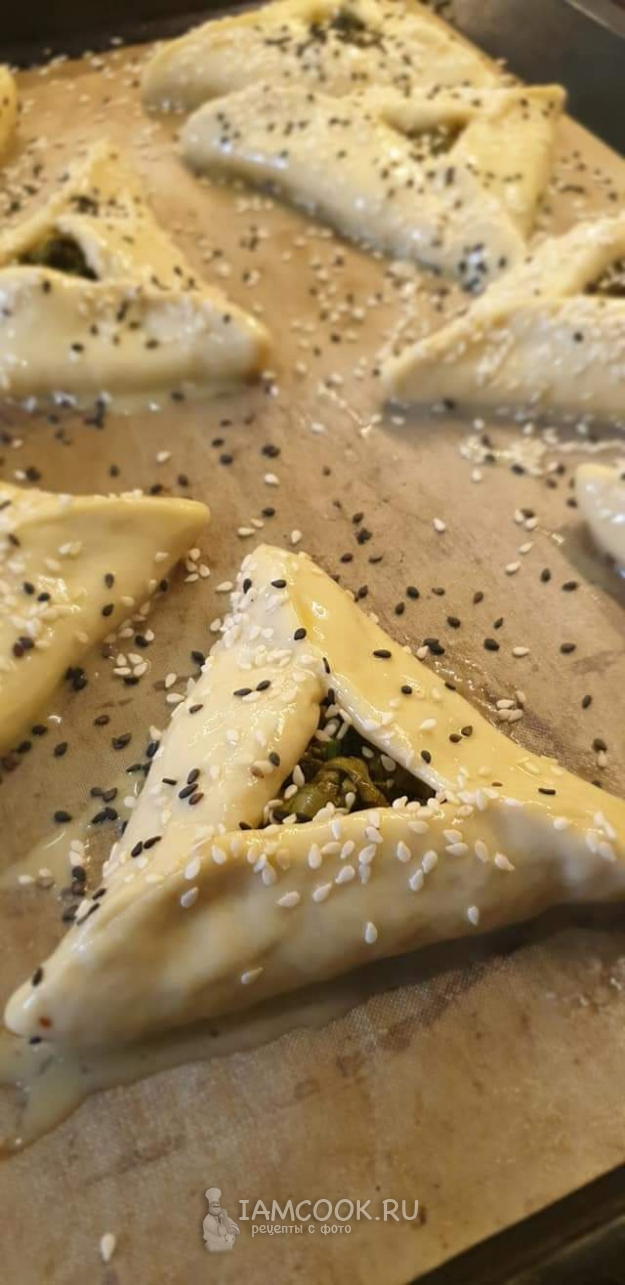Выложить пирожки на противень, застеленный пергаментом, накрыть и оставить на 20 минут для расстойки. Затем смазать желтком, перемешанным с ложкой молока, посыпать кунжутом.