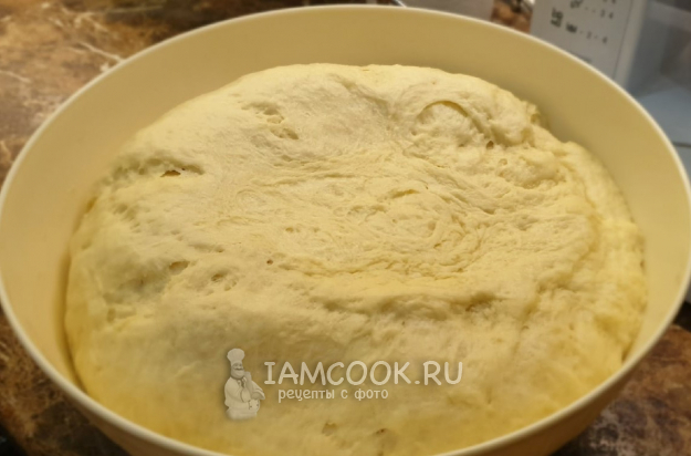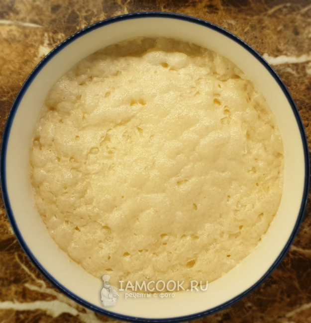 Накрыть пищевой плёнкой и убрать в тёплое место до увеличения объёма минимум в 2 раза, на это уходит час-полтора.