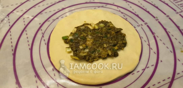 Подошедшее тесто обмять, разделить на 14 частей. Скатать в шарики и накрыть пищевой плёнкой. Затем раскатать круг, выложить начинку.
