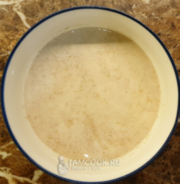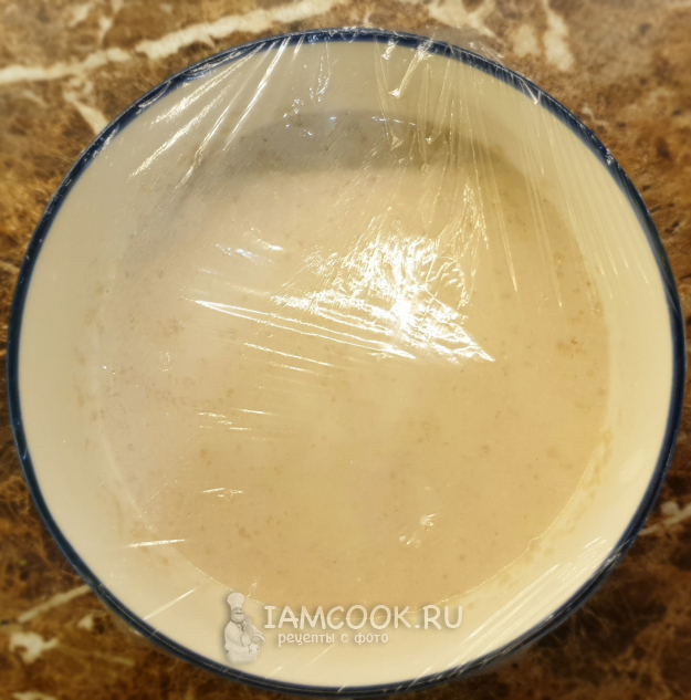 Накрыть пищевой плёнкой, проколоть зубочисткой несколько дырочек, чтоб опара дышала, и убрать в тёплое место минут на 40, пока не запузырится и хорошо не увеличится в объёме.