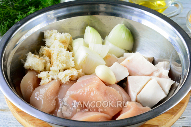 Подготовьте все ингредиенты для фарша. Сполосните куриное филе и нарежьте крупными кусочками. Таким же образом измельчите соленое сало. Почистите лук и чеснок, их также нарежьте. Белый хлеб замочите в воде на несколько секунд, отожмите и добавьте к мясу.