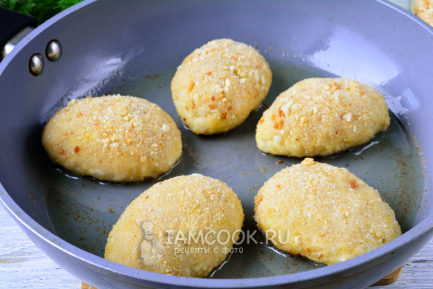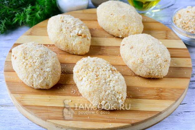 Смочите руки в воде, слепите котлеты и запанируйте их в сухарях.
