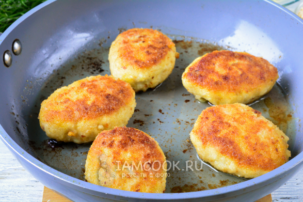 Разогрейте масло на сковороде, выложите котлеты и начните жарить.