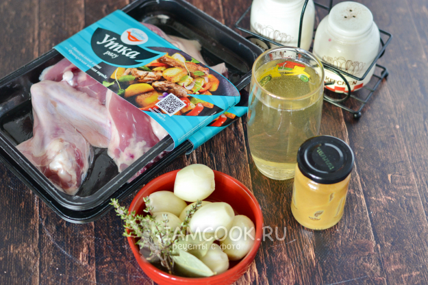 Набор продуктов для приготовления кусочков утки в утятнице в духовке представлен на фото ниже.