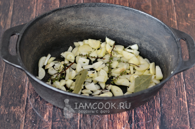На дно утятницы положите нарезанный лук-шалот, веточки тимьяна и лавр.
