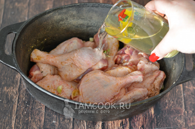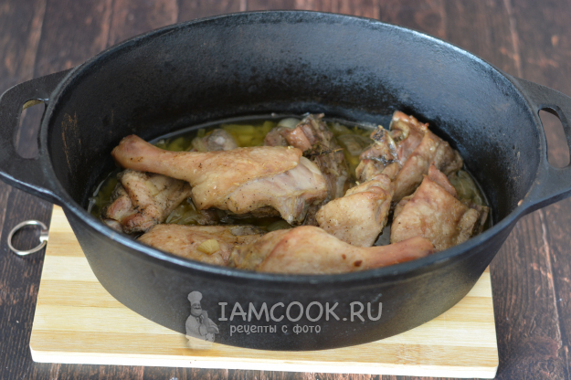 Выложите куски утки и залейте вином. Вино, кстати можно использовать и красное, но имейте в виду, что от красного вина утка поменяет цвет.