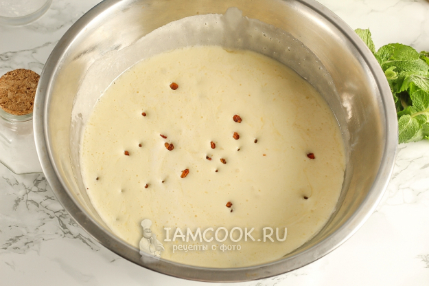 Высыпьте изюм и влейте коньяк. Алкоголь выбирайте качественный, чтобы он не оставил в тесте горького послевкусия! И изюм, и коньяк помогут активизировать дрожжи! Перемешайте.
