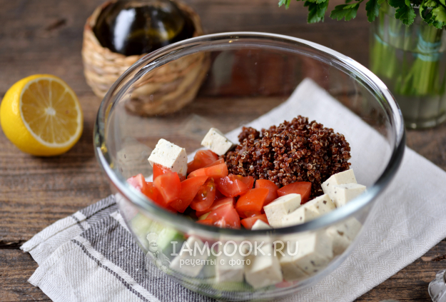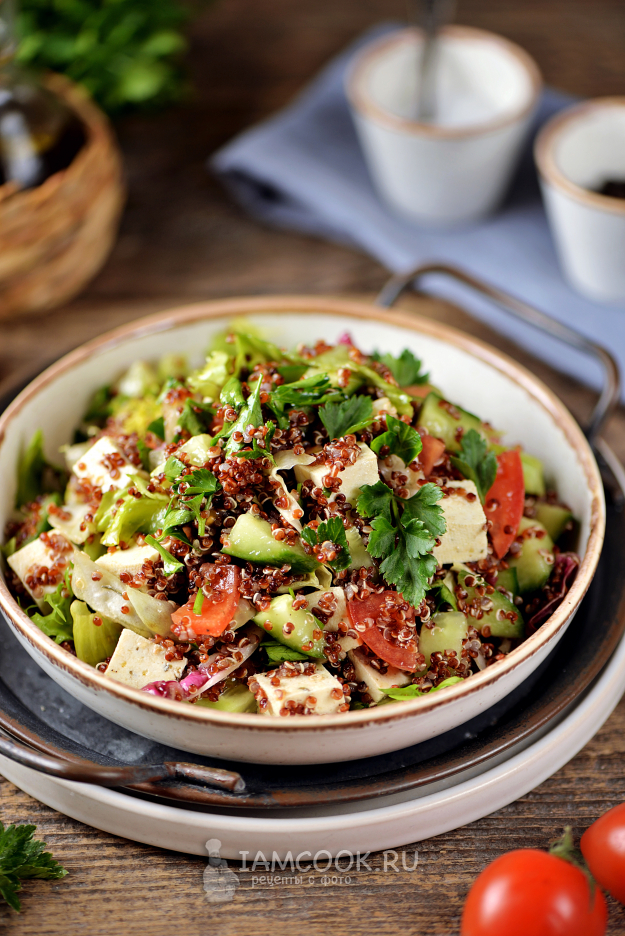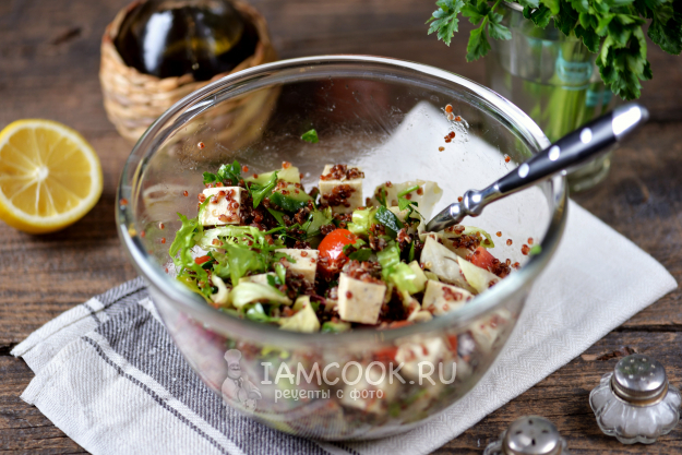 Подавать постный салат с киноа и сыром тофу нужно сразу же после приготовления, пока овощи не пустили сок.