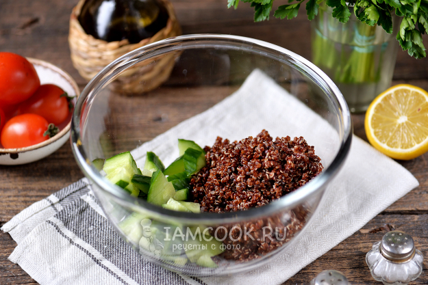 Переложите готовое и остывшее киноа в глубокую миску, добавьте нарезанный небольшим кубиком огурец.