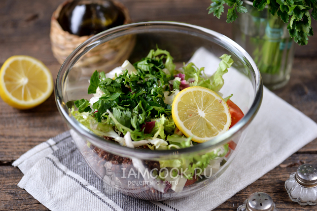 Положите щедрую горсть салатной смеси и рубленую петрушку, заправьте все оливковым маслом и лимонным соком.
