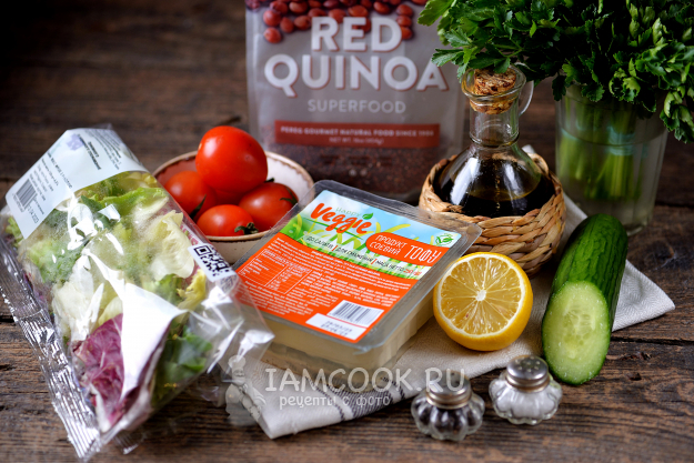 Для приготовления постного салата с тофу и киноа вам понадобятся все ингредиенты, что на фото.