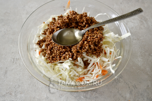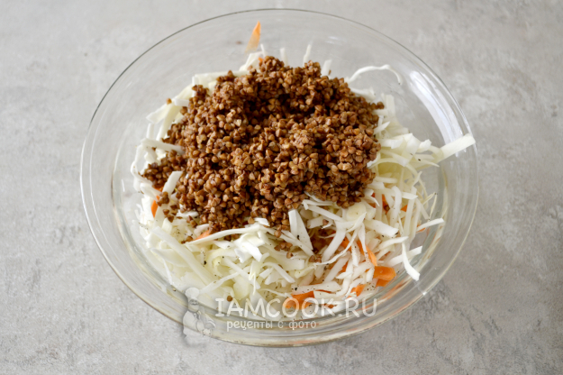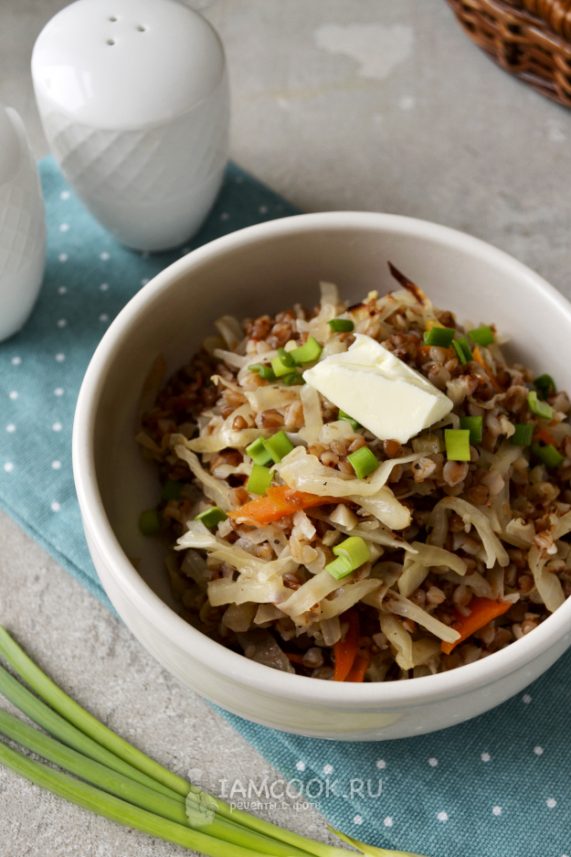 Подавайте капусту с гречкой сразу, горячей. Можно добавить в тарелку кусочек сливочного масла, посыпать свежей зеленью.
