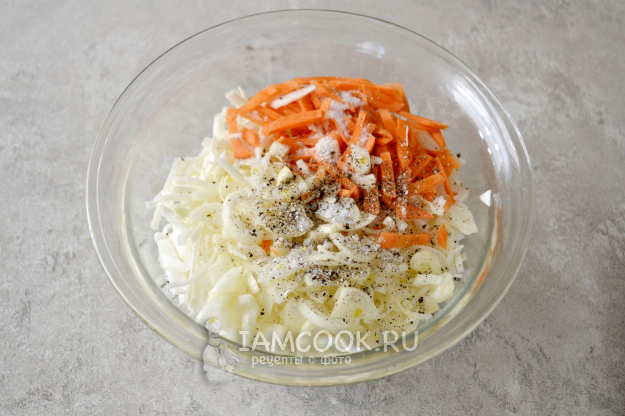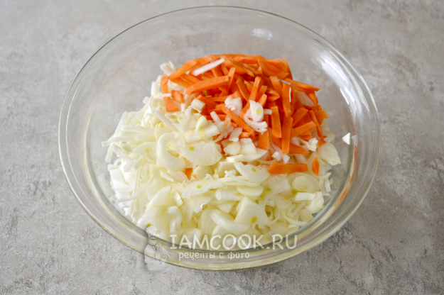 Капусту нарежьте тонкой соломкой, морковь натрите на крупной терке или нарежьте соломкой, лук нарежьте полукольцами, сложите все нарезанные овощи в глубокую миску.