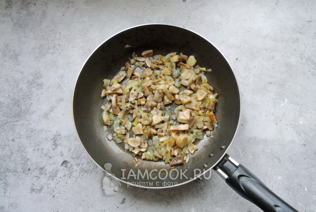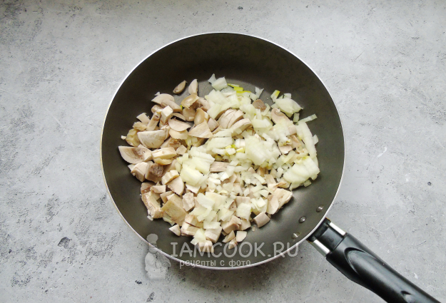 Шампиньоны и лук очистите, помойте и нарежьте. Выложите в сковороду с подсолнечным маслом.