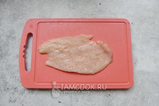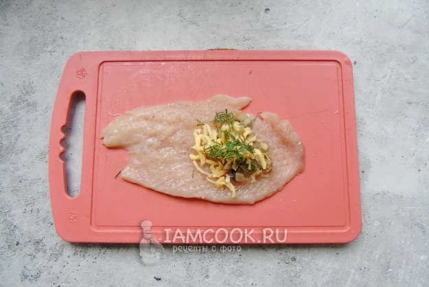 Каждое филе посолите, поперчите. На край выложите столовую ложку жареных грибов с луком, немного тертого сыра и зелени.