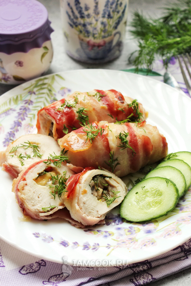 Куриные рулетики с грибами в беконе готовы. Подавайте с овощами, соленьями, любым гарниром.