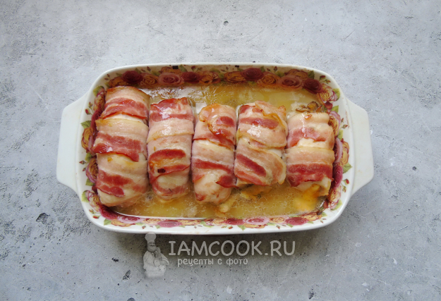 Выложите рулетики в беконе в форму для запекания. Налейте 3-4 столовые ложки воды или бульона.