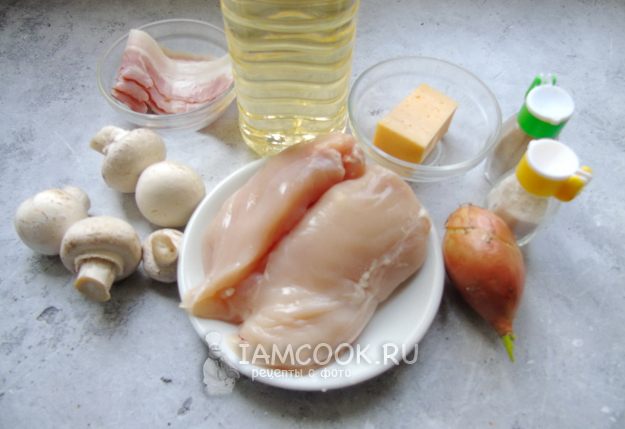 Соберите все ингредиенты для приготовления куриных рулетиков с грибами в беконе, которые перед вами - на фото.