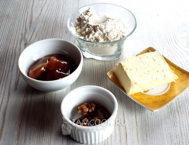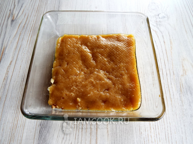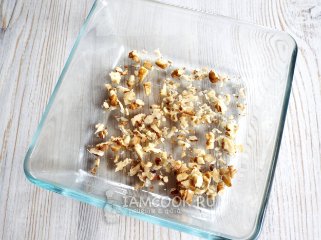 На дно небольшой формы нарезать орехи. Можно сделать щедрый слой.