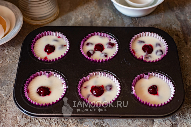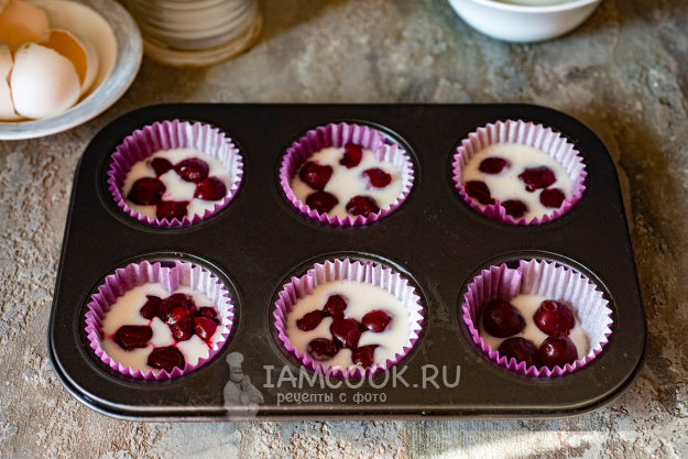 Я пекла кексы в таких, как на фото, формочках (6 штук) и в силиконовых (5 штук). Сначала формочки заполняем на 1/3 от объема тестом, затем выкладываем по вкусу ягодки вишни.