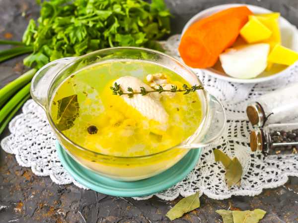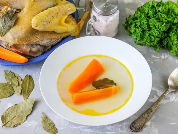 Добавьте надрезанную крестообразно маленькую луковицу, порезанную крупными кусочками морковь. Сделайте огонь под сотейником самым тихим, прикройте крышкой и варите бульон минут 30, он должен еле булькать.