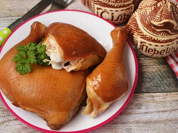 Срежьте весь жир с внутренней стороны окорока, разрежьте его на три части - по коленному суставу и вдоль спины, если окорок с частью хребта и хвостиком. Помойте куски курицы, стряхните воду.