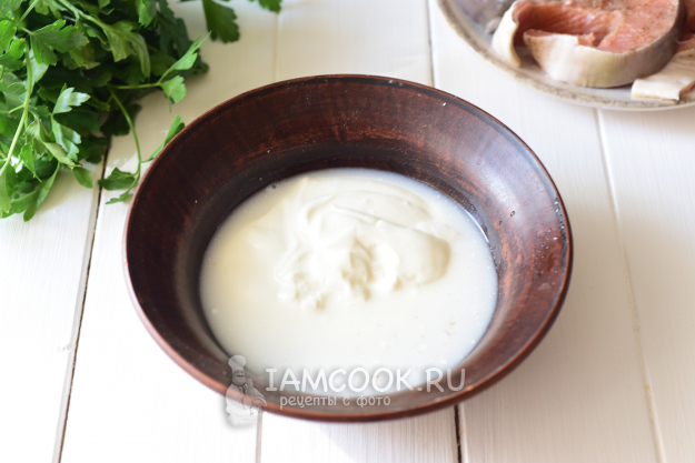 В миску выложим всю сметану, добавим воду, соль. Перемешаем.