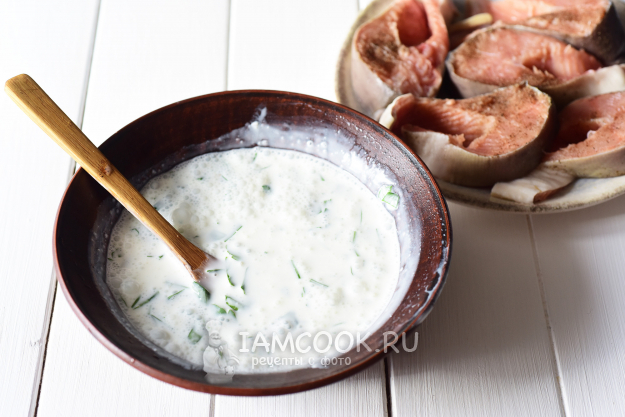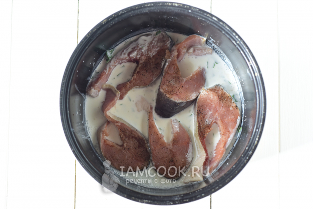 На дно чаши мультиварки выльем половину сметанного соуса, поверх разложим стейки горбуши.
