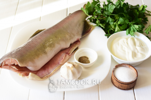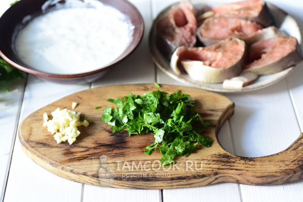Соберём ингредиенты для приготовления тушеной горбуши в сметане в мультиварке. Чеснок почистим, зелень ополоснем в проточной воде. Горбушу тщательно почистим, помоем, отрежем все плавники и хвост.