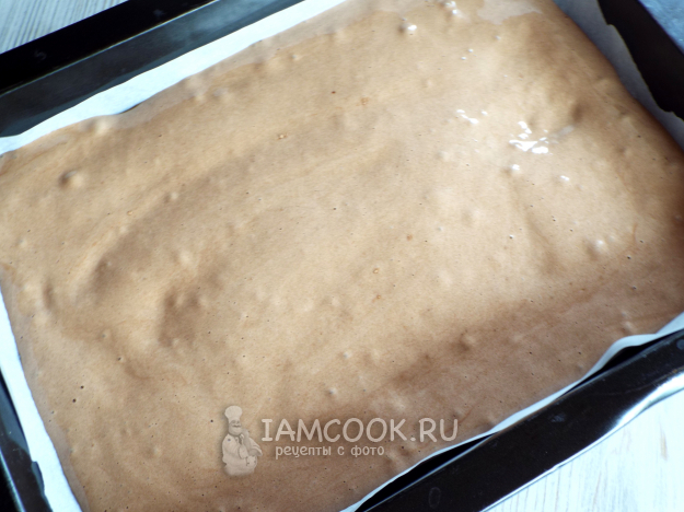 Развернуть остывший бисквит. Выложить часть крема и разровнять.