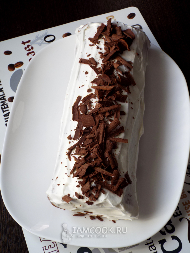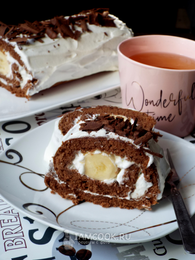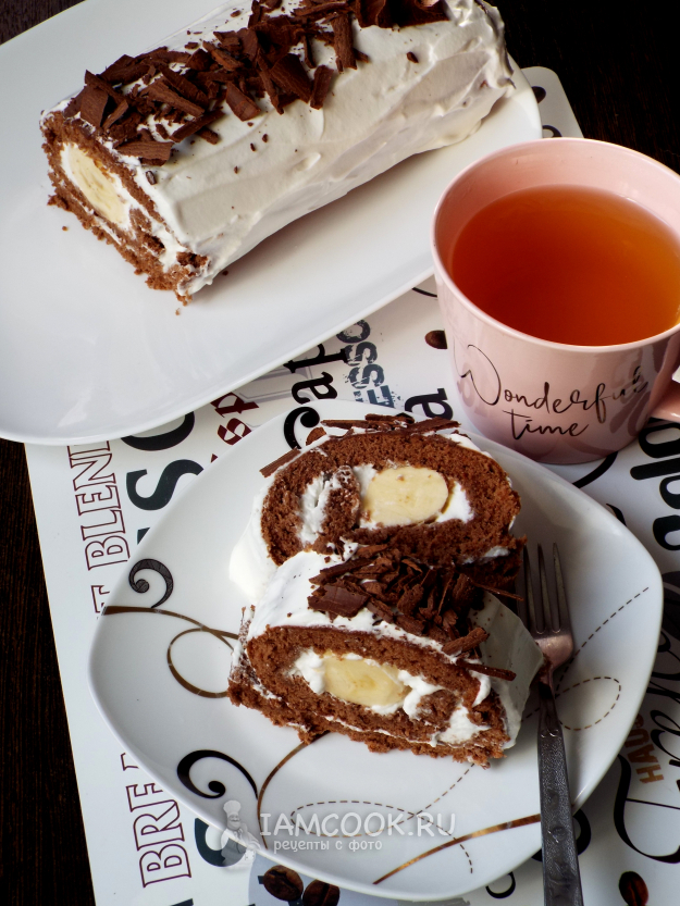 Украсить шоколадный рулет с бананом и сливочным кремом по желанию.