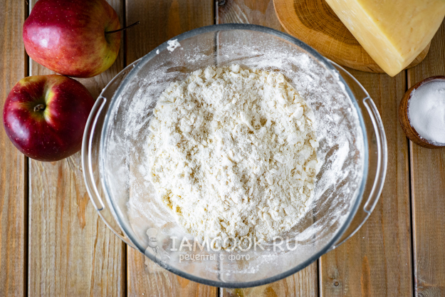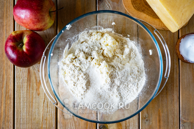 Поверх разложим натертый сыр. Выпекать яблочный пирог с сыром будем в уже разогретой до 180 градусов духовке примерно 30-35 минут.