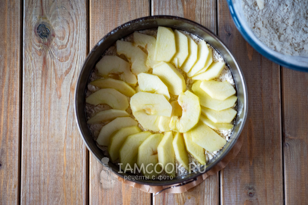 Поверх распределим слоем яблочные дольки.