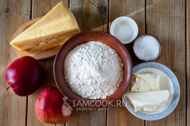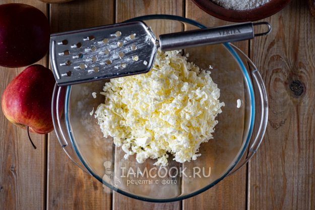 Подготовим необходимые ингредиенты для насыпного яблочного пирога с сыром. Масло должно быть ледяным, поэтому на 20 минут поместим заранее его в морозильную камеру.