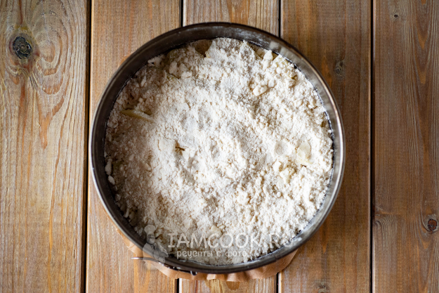 Затем яблочный слой присыплем оставшейся частью мучной крошки.