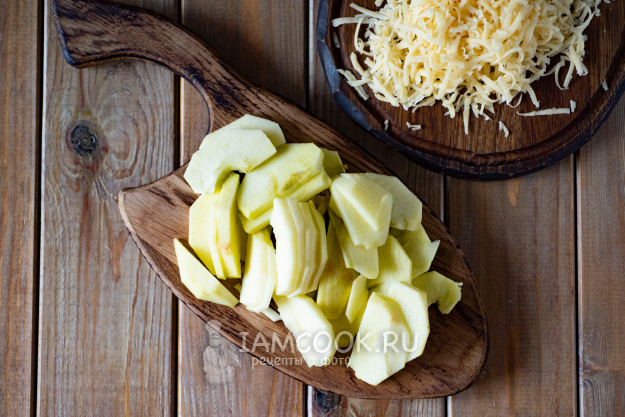 Яблоки освободим от кожуры и семян, нарежем тонкими пластинами.