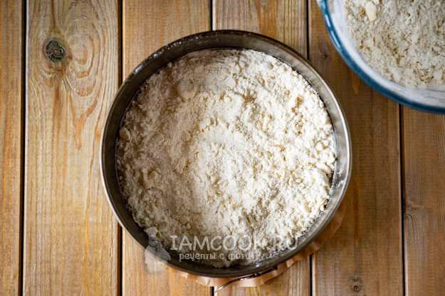На дно формы выложим пергамент для выпекания, поверх распределим половину мучной крошки.