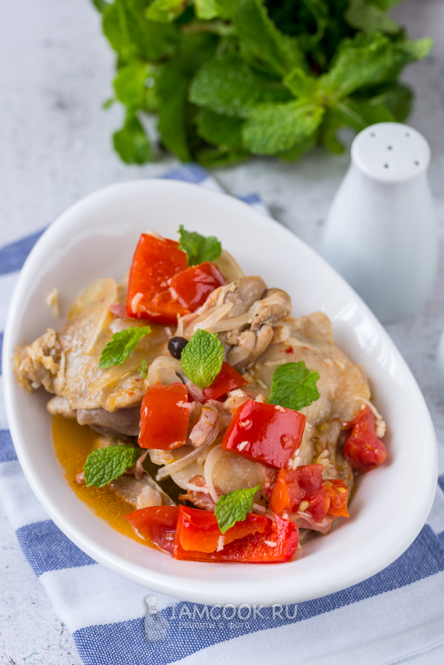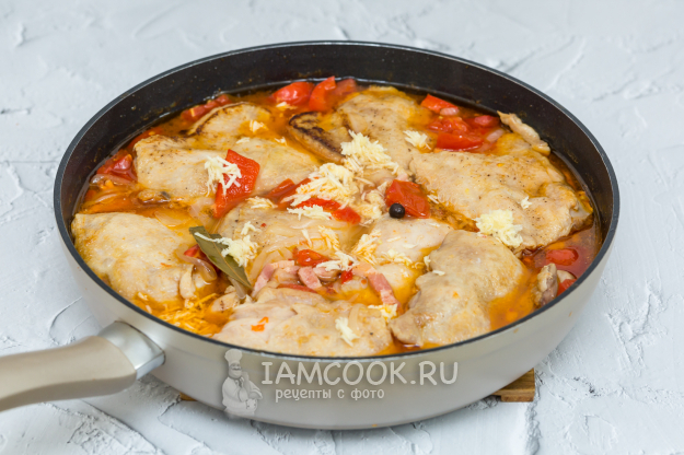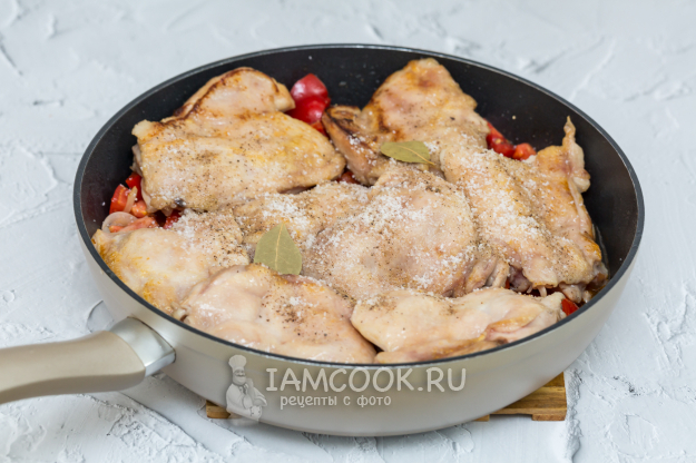 Добавьте немного воды (с учетом того, что овощи дадут еще сок) и тушите куриные бедра с овощами на сковороде под крышкой до готовности мяса.